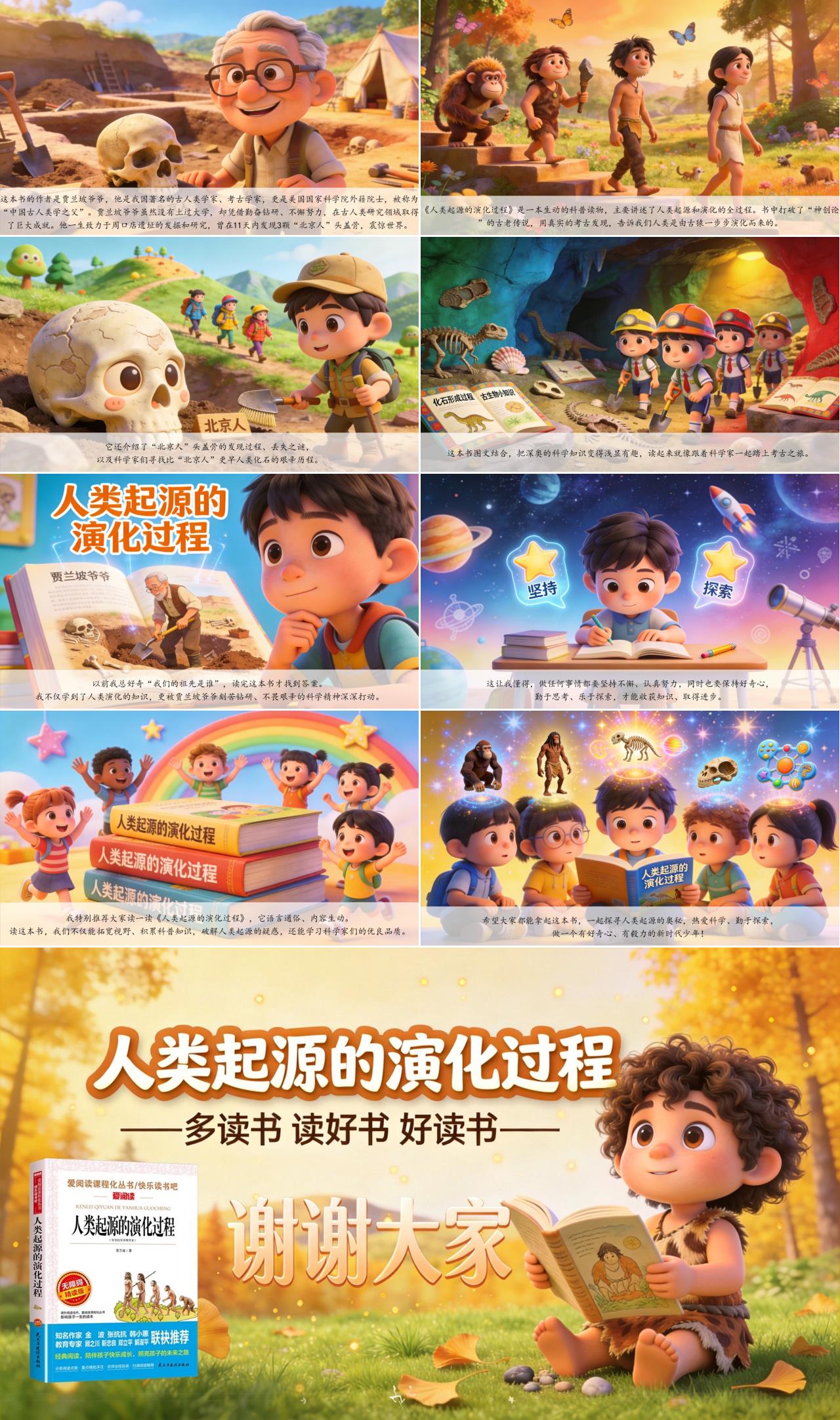 我特别推荐大家读一读《人类起源的演化过程》,它语言通俗、内容生动。读这本书,我们不仅能拓宽视野、积累科普知识,破解人类起源的疑惑,还能学习科学家们的优良品质。希望大家都能拿起这本书,一起探寻人类起源的奥秘,热爱科学、勤于探索,做一个有好奇心、有毅力的新时代少年!我的分享完毕,谢谢大家!
