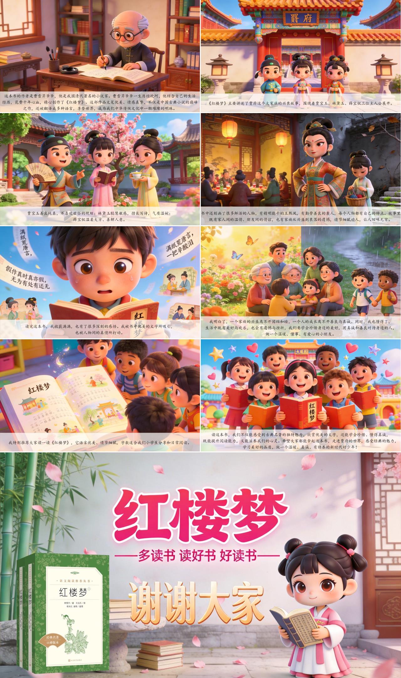 我特别推荐大家读一读《红楼梦》,它语言优美、情节细腻。读这本书,我们不仅能感受到古典名著的独特魅力,欣赏优美的文字,还能学会珍惜、懂得真诚,既能提升阅读能力,又能滋养我们的心灵。希望大家都能拿起这本书,走进贾府的世界,感受经典的魅力,学习美好的品质,做一个温暖、真诚、有修养的新时代好少年!我的分享完毕,谢谢大家!