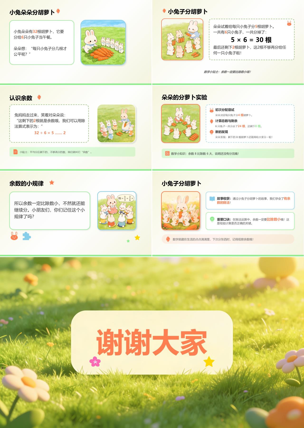 兔妈妈走过来,笑着对朵朵说:“这剩下的2根就是余数哦,我们可以用除法算式表示为32÷6=5……2。”朵朵点点头,又试了试,如果每只兔子分4根,6只兔子分24根,剩下8根,还能再分一轮,所以余数一定比除数小,不然就还能继续分。小朋友们,你们记住这个小规律了吗?