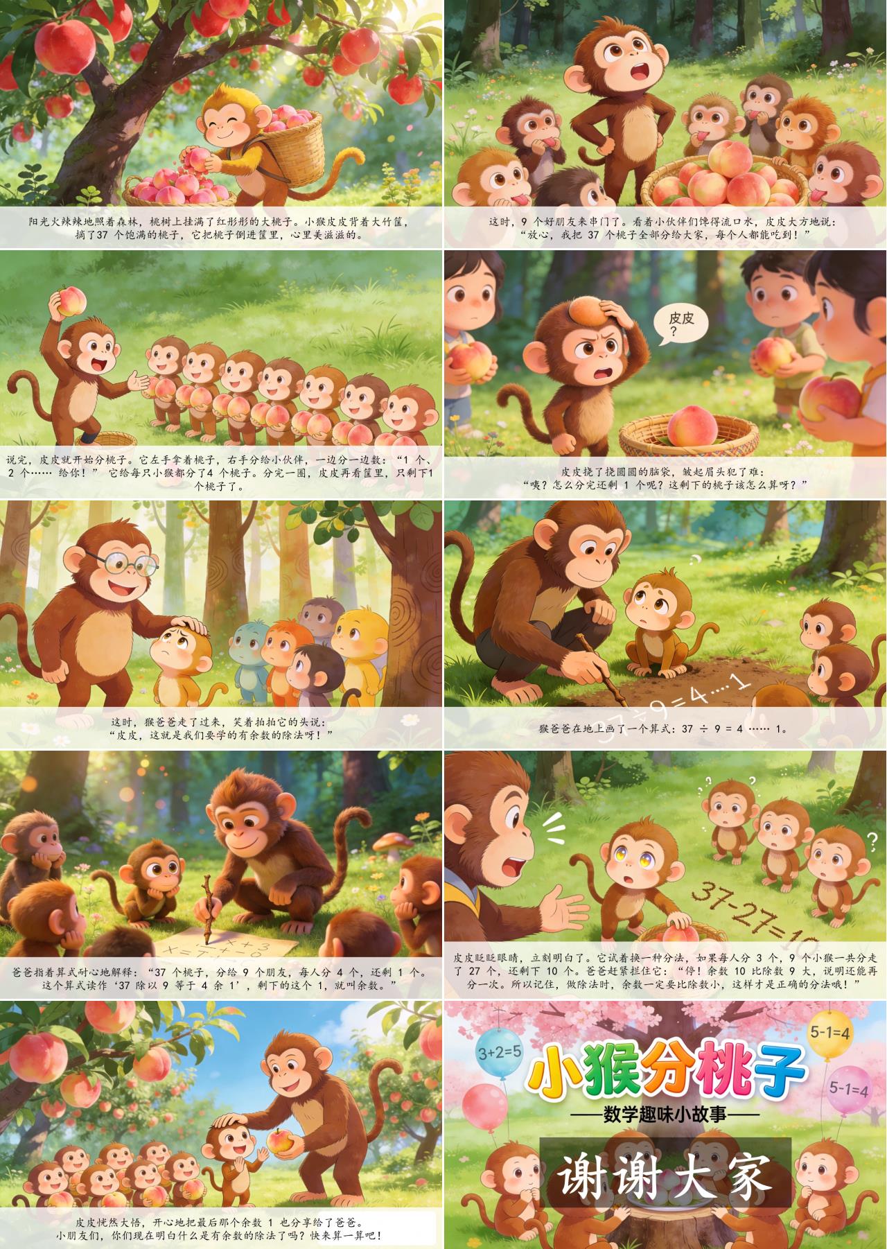 这时,猴爸爸走了过来,笑着拍拍它的头说:“皮皮,这就是我们要学的有余数的除法呀!” 猴爸爸在地上画了一个算式:37 ÷ 9 = 4 …… 1。