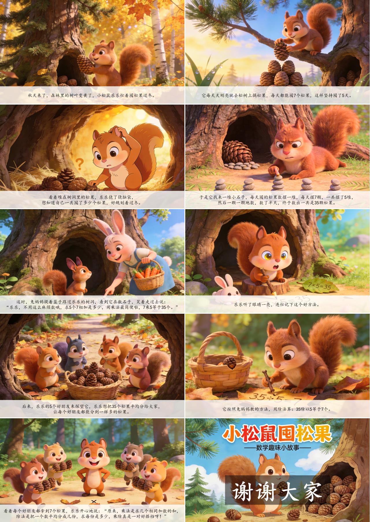这时,兔妈妈提着篮子路过乐乐的树洞,看到它在数石子,笑着走过去说:“乐乐,不用这么麻烦数哦,求5个7相加是多少,用乘法最简便啦,7乘5等于35个。”乐乐听了眼睛一亮,连忙记下这个好方法。后来,乐乐的5个好朋友来探望它,乐乐想把35个松果平均分给大家,让每个好朋友都能分到一样多的松果。它按照兔妈妈教的方法,用除法算:35除以5等于7个。看着每个好朋友都拿到7个松果,乐乐开心地说:“原来,乘法是求几个相同加数的和,除法是把一个数平均分成几份,求每份是多少,乘除真是一对好搭档呀!”