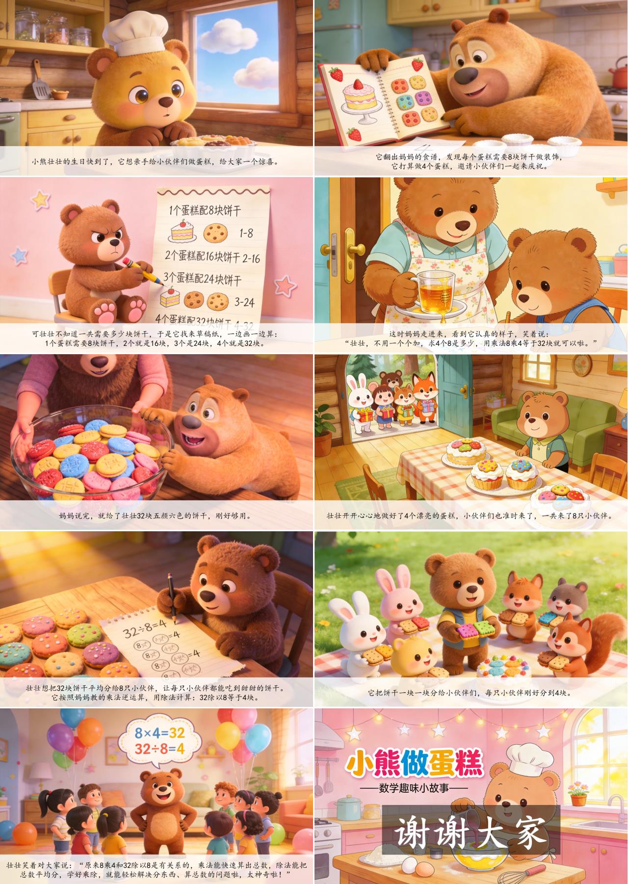 壮壮开开心心地做好了4个漂亮的蛋糕,小伙伴们也准时来了,一共来了8只小伙伴。壮壮想把32块饼干平均分给8只小伙伴,让每只小伙伴都能吃到甜甜的饼干。它按照妈妈教的乘法逆运算,用除法计算:32除以8等于4块。它把饼干一块一块分给小伙伴们,每只小伙伴刚好分到4块。壮壮笑着对大家说:“原来8乘4和32除以8是有关系的,乘法能快速算出总数,除法能把总数平均分,学好乘除,就能轻松解决分东西、算总数的问题啦,太神奇啦!”
