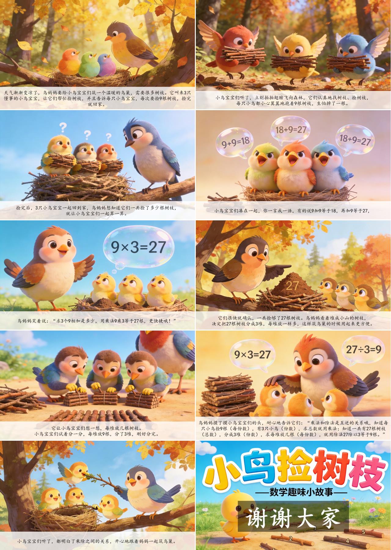 天气渐渐变凉了,鸟妈妈要给小鸟宝宝们筑一个温暖的鸟巢,需要很多树枝。它叫来3只懂事的小鸟宝宝,让它们帮忙捡树枝,并且告诉每只小鸟宝宝,每次要捡9根树枝,捡完就回家。小鸟宝宝们听了,立刻拍拍翅膀飞向森林,它们认真地找树枝、捡树枝,每只小鸟都小心翼翼地抱着9根树枝,生怕掉了一根。捡完后,3只小鸟宝宝一起回到家,鸟妈妈想知道它们一共捡了多少根树枝,就让小鸟宝宝们一起算一算。小鸟宝宝们凑在一起,你一言我一语,有的说9加9等于18,再加9等于27,鸟妈妈笑着说:“求3个9相加是多少,用乘法9乘3等于27根,更快捷哦!”它们很快就确认,一共捡够了27根树枝。