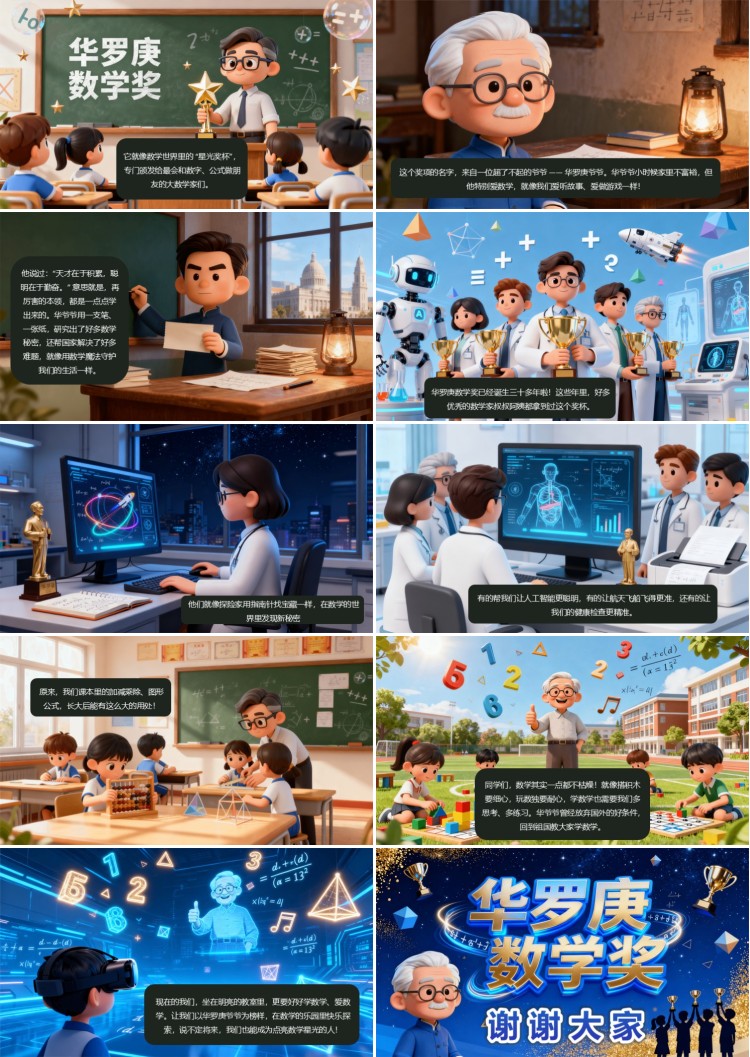 这个奖项的名字,来自一位超了不起的爷爷 —— 华罗庚爷爷。华爷爷小时候家里不富裕,但他特别爱数学,就像我们爱听故事、爱做游戏一样!他说过:“天才在于积累,聪明在于勤奋。” 意思就是,再厉害的本领,都是一点点学出来的。华爷爷用一支笔、一张纸,研究出了好多数学秘密,还帮国家解决了好多难题,就像用数学魔法守护我们的生活一样。