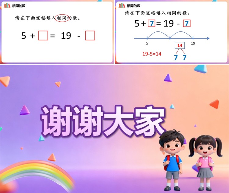 我们用19-5=14。我们把5和19的差分成相等的两份,14可以分成7和7。所以,这里是7(加在5上),那这里也是7(从19中减去)。