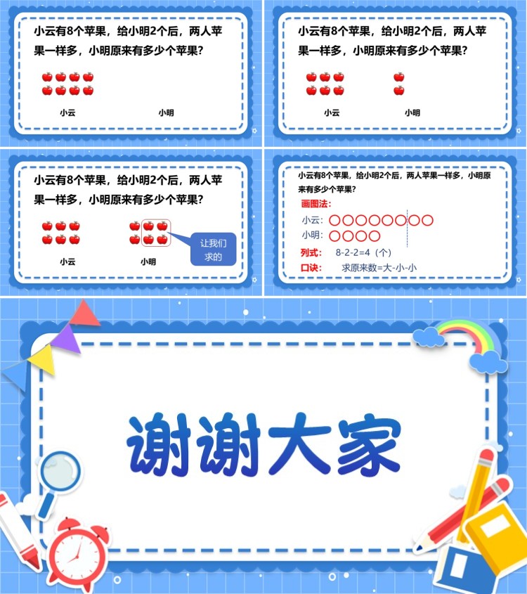 这里还有一个好用的口诀要分享给大家:求原来数 = 大 - 小 - 小。这里的 “大” 就是小云原来有的苹果数 8,“小” 就是小云给小明的苹果数 2,用大的数减去两次小的数,就能算出小明原来的苹果数啦!