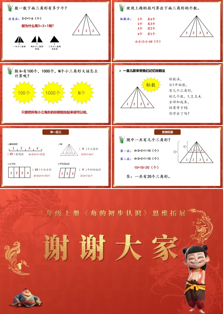 像这样一个大三角形被分成3个小三角形我们可以直接把标数相加起来3+2+1=6(个)。
