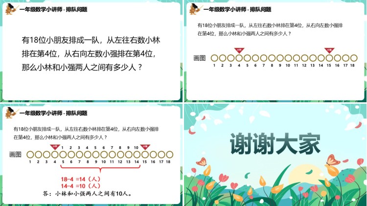题目是这样的:有18位小朋友排成一队,从左往右数小林排在第4位,从右向左数小强排在第4位。求小林和小强两人之间有多少人。