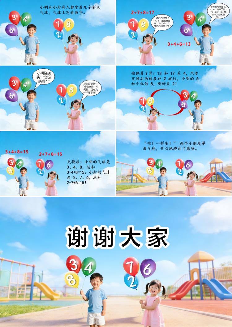 小红眨眨眼:“咱们交换一个气球,让总和一样好不好?”小明挠挠头:“怎么换呀?”