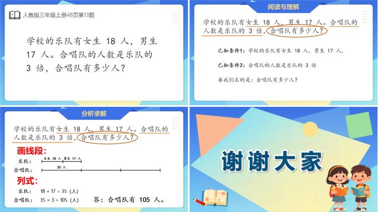 我们先一起读下题目:“学校的乐队有女生18人,男生17人。合唱队的人数是乐队的3倍,合唱队有多少人?”