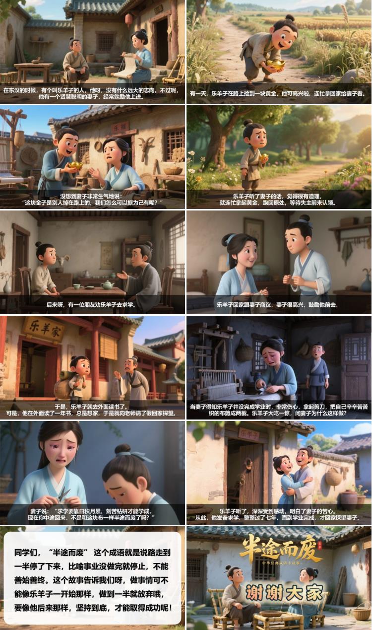 同学们,“半途而废” 这个成语就是说路走到一半停了下来,比喻事业没做完就停止,不能善始善终。这个故事告诉我们呀,做事情可不能像乐羊子一开始那样,做到一半就放弃哦,要像他后来那样,坚持到底,才能取得成功呢!