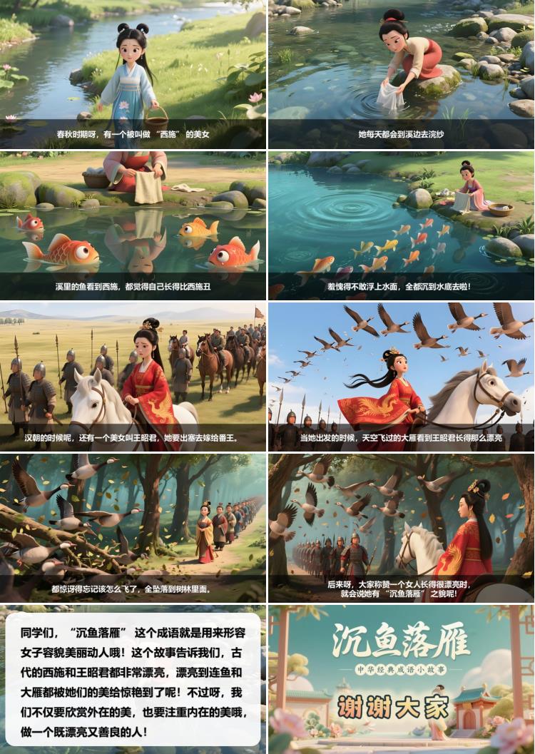 同学们,“沉鱼落雁” 这个成语就是用来形容女子容貌美丽动人哦!这个故事告诉我们,古代的西施和王昭君都非常漂亮,漂亮到连鱼和大雁都被她们的美给惊艳到了呢!不过呀,我们不仅要欣赏外在的美,也要注重内在的美哦,做一个既漂亮又善良的人!