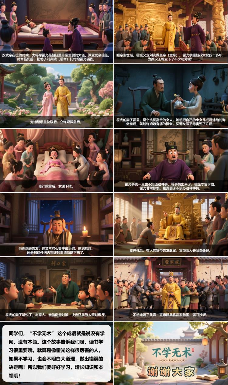 同学们,“不学无术” 这个成语就是说没有学问,没有本领。这个故事告诉我们呀,读书学习很重要哦,就算是像霍光这样很厉害的人,如果不学习,也会不明白大道理,做出错误的决定呢!所以我们要好好学习,增长知识和本领哦!