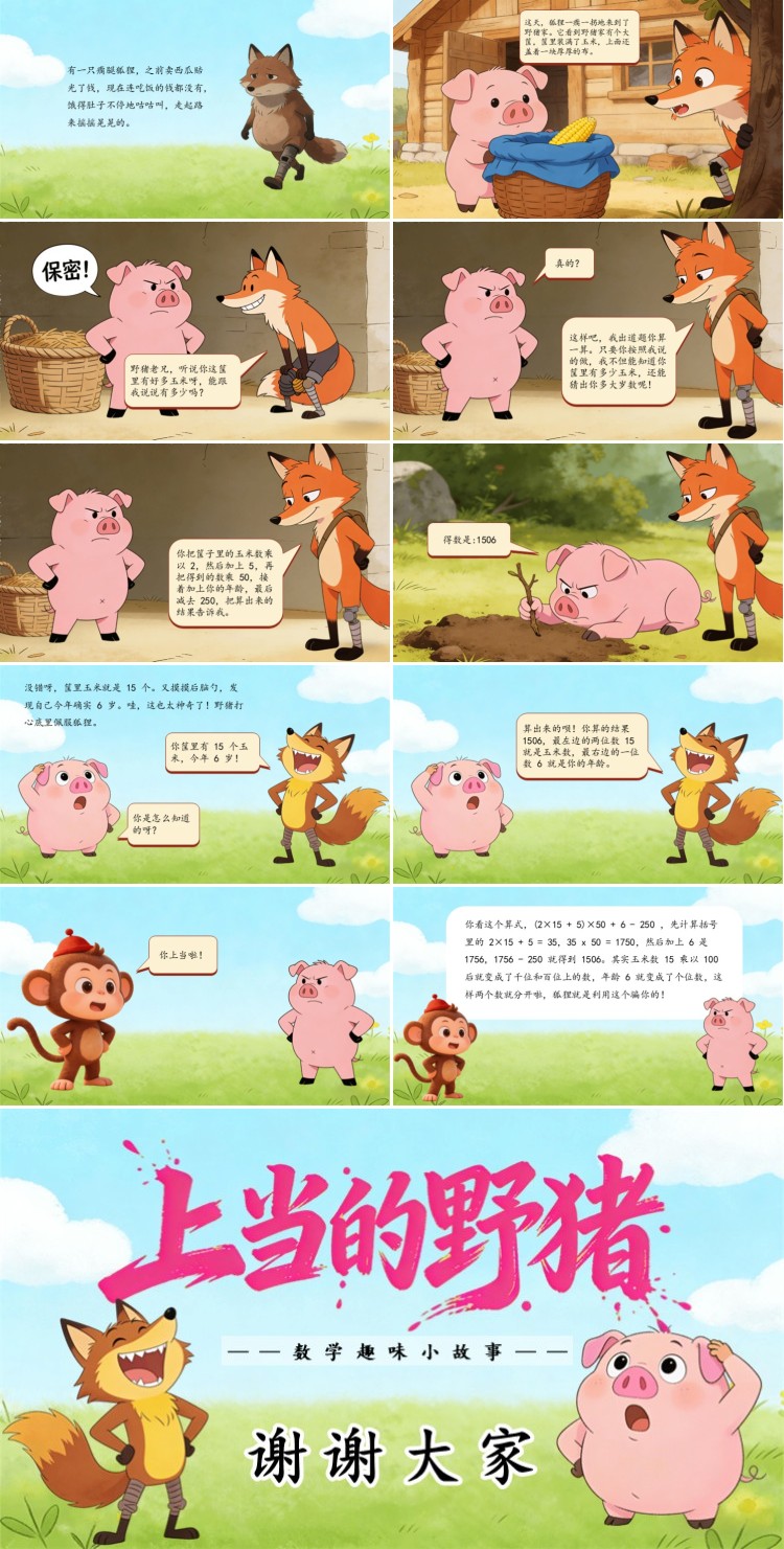 小猴耐心地解释:“你看这个算式,(2×15 + 5)×50 + 6 - 250 ,先计算括号里的 2×15 + 5 等于 35,35 再乘 50 就是 1750,然后加上 6 是 1756,最后减去 250 就得到 1506。其实玉米数 15 乘以 100 后就变成了千位和百位上的数,年龄 6 就变成了个位数,这样两个数就分开啦,狐狸就是利用这个骗你的!” 这下,野猪才恍然大悟,原来自己真的被狐狸骗了。