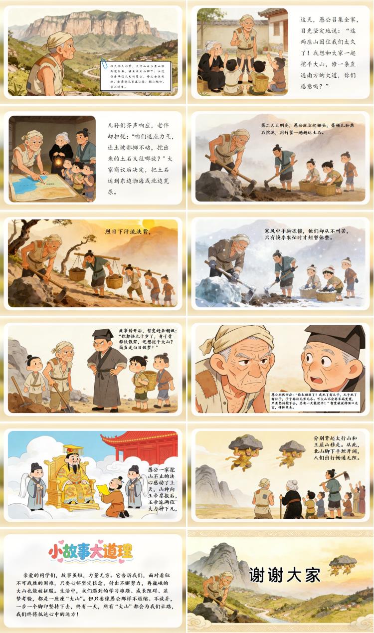 亲爱的同学们,故事虽短,力量无穷。它告诉我们,面对看似不可战胜的困难,只要心怀坚定信念,付出不懈努力,再巍峨的大山也能被征服。生活中,我们遇到的学习难题、成长阻碍、追梦考验,都是一座座 “大山”。但只要像愚公那样不退缩、不放弃,一步一个脚印坚持下去,终有一天,所有 “大山” 都会为我们让路,我们终将抵达心中的远方!