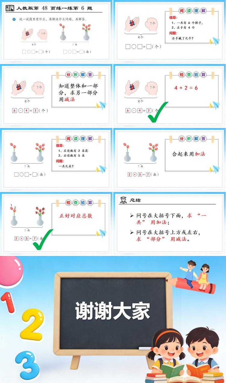 最后总结规律:问号在大括号下面,求 “一共” 用加法;问号在大括号上方或左右,求 “部分” 用减法。