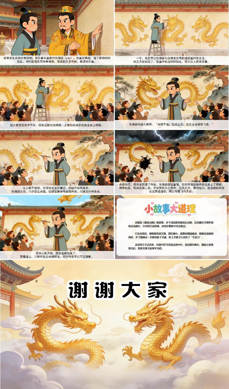 这就是《画龙点睛》的故事。这个成语原指画龙后点睛,后比喻在关键处简明点出核心,让内容生动传神,也指在整体中突出重点。