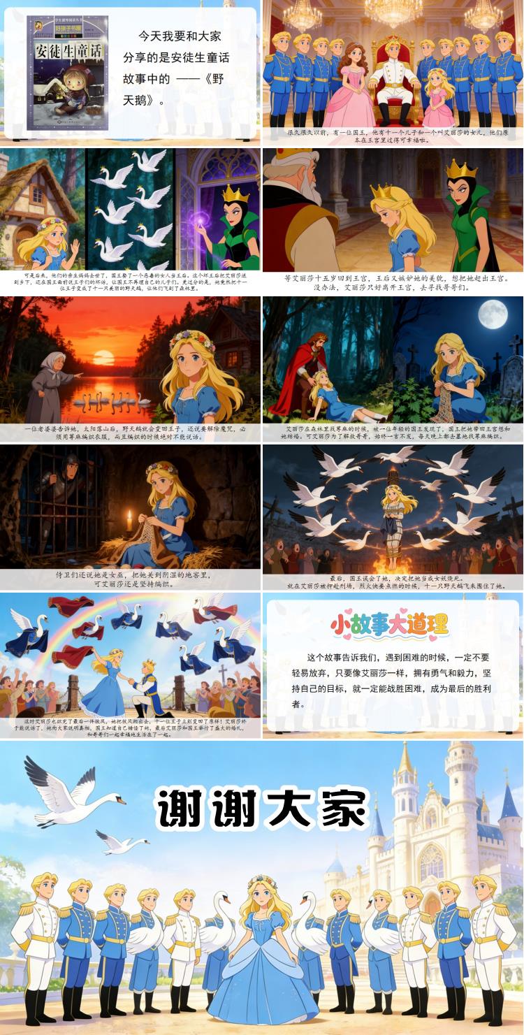 大家好,我是三年级一班的众晨星,今天我要和大家分享的是安徒生童话故事中的 ——《野天鹅》。