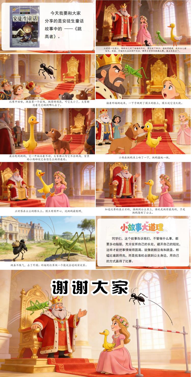 同学们,这个故事告诉我们,不管做什么事,都要多动脑筋,充分发挥自己的长处,避开自己的短处,这样才能把事情做得圆满。就像跳鹅没有和跳蚤、蚱蜢比谁跳得高,而是找准机会跳到公主身边,用自己的方式赢得了比赛。