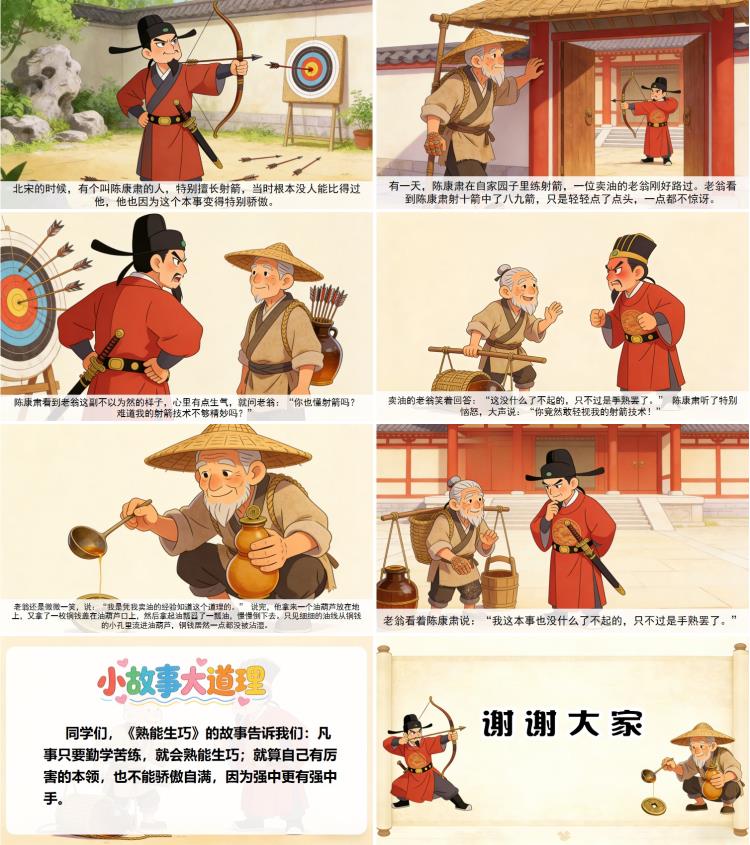 同学们,《熟能生巧》的故事告诉我们:凡事只要勤学苦练,就会熟能生巧;就算自己有厉害的本领,也不能骄傲自满,因为强中更有强中手。