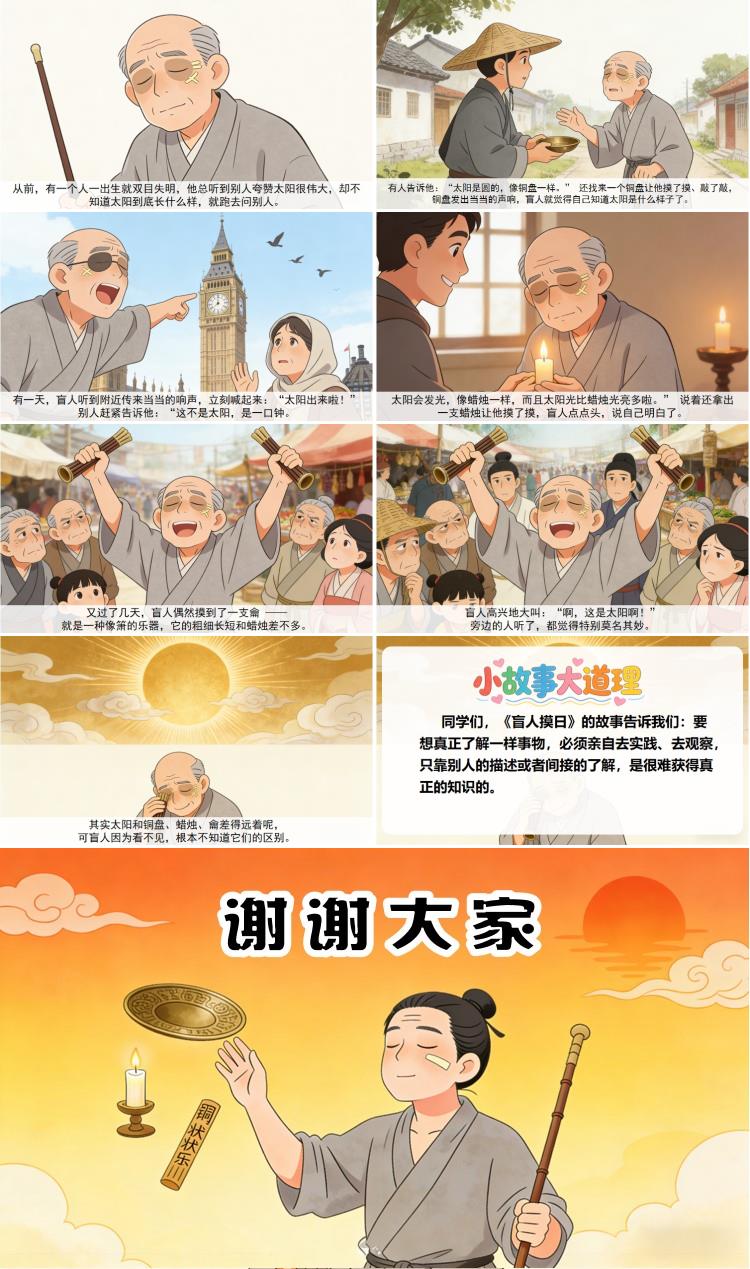 同学们,《盲人摸日》的故事告诉我们:要想真正了解一样事物,必须亲自去实践、去观察,只靠别人的描述或者间接的了解,是很难获得真正的知识的。