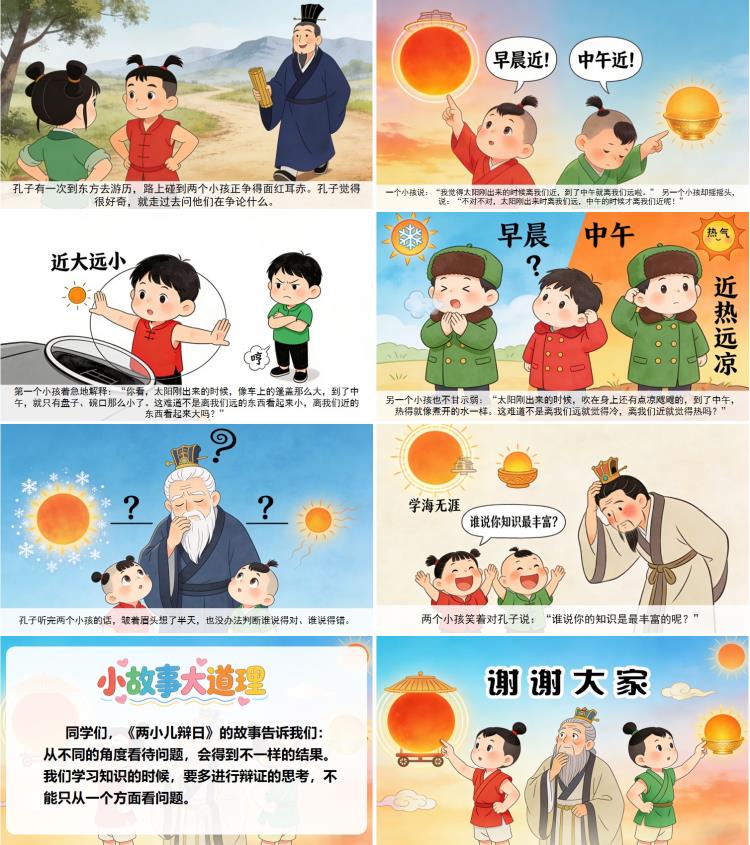 同学们,《两小儿辩日》的故事告诉我们:从不同的角度看待问题,会得到不一样的结果。我们学习知识的时候,要多进行辩证的思考,不能只从一个方面看问题。