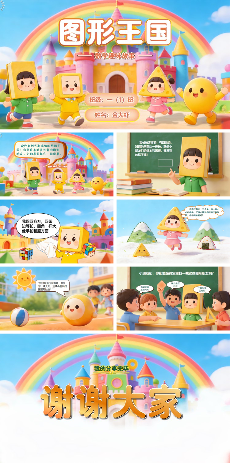 小朋友们大家好呀!我是一年级一班的金大虾,欢迎来到五彩缤纷的图形王国!这里住着好多可爱的图形朋友,它们每天都在一起玩耍。长方形姐姐穿着绿色的衣服,它笑着说:“我长长方方的,有四条边,对面的两条边一样长,就像小朋友们的课本和黑板,都是我的样子呢!”正方形弟弟穿着黄色的衣服,骄傲地挺起胸脯:“我四四方方的,四条边都一样长,四个角也一样大,小朋友们的手帕、魔方的面,都是我哦!”三角形妹妹穿着粉色的衣服,蹦蹦跳跳地过来说:“我有三条边,三个角,像一座小小的山尖,又像小朋友们吃的三角饭团,你们喜欢我吗?”还有圆形哥哥,它长得圆滚滚的,滚来滚去说:“我没有边也没有角,像皮球、像太阳,还像小朋友们圆圆的脸蛋!”图形王国真热闹呀!小朋友们,你们能在教室里找一找这些图形朋友吗?比如书桌的面是长方形,橡皮是正方形,三角尺是三角形,快和身边的小伙伴分享你的发现吧!