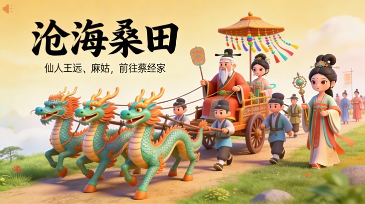 宴饮完毕,王远、麻姑各自召来车驾,升天成仙而去。