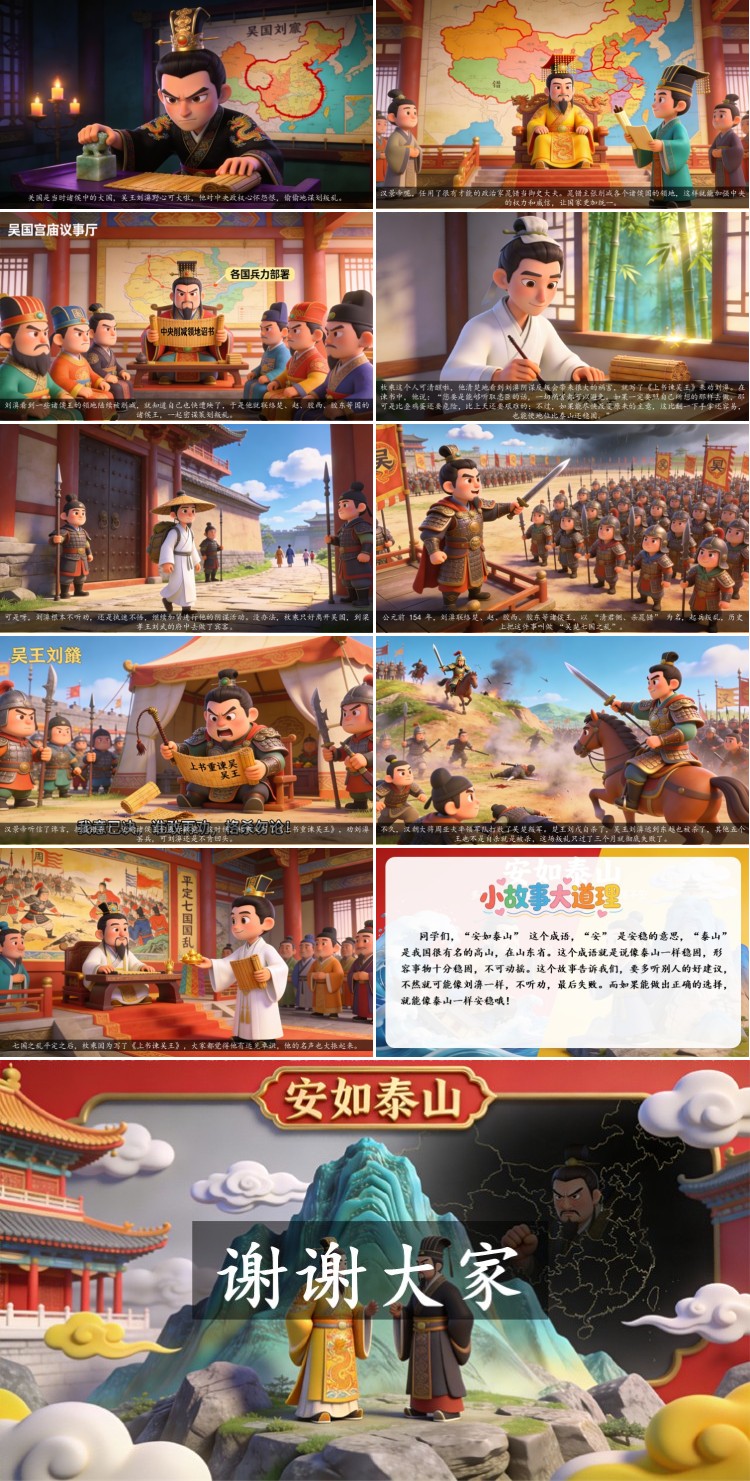 同学们,“安如泰山” 这个成语,“安” 是安稳的意思,“泰山” 是我国很有名的高山,在山东省。这个成语就是说像泰山一样稳固,形容事物十分稳固,不可动摇。这个故事告诉我们,要多听别人的好建议,不然就可能像刘濞一样,不听劝,最后失败。而如果能做出正确的选择,就能像泰山一样安稳哦!