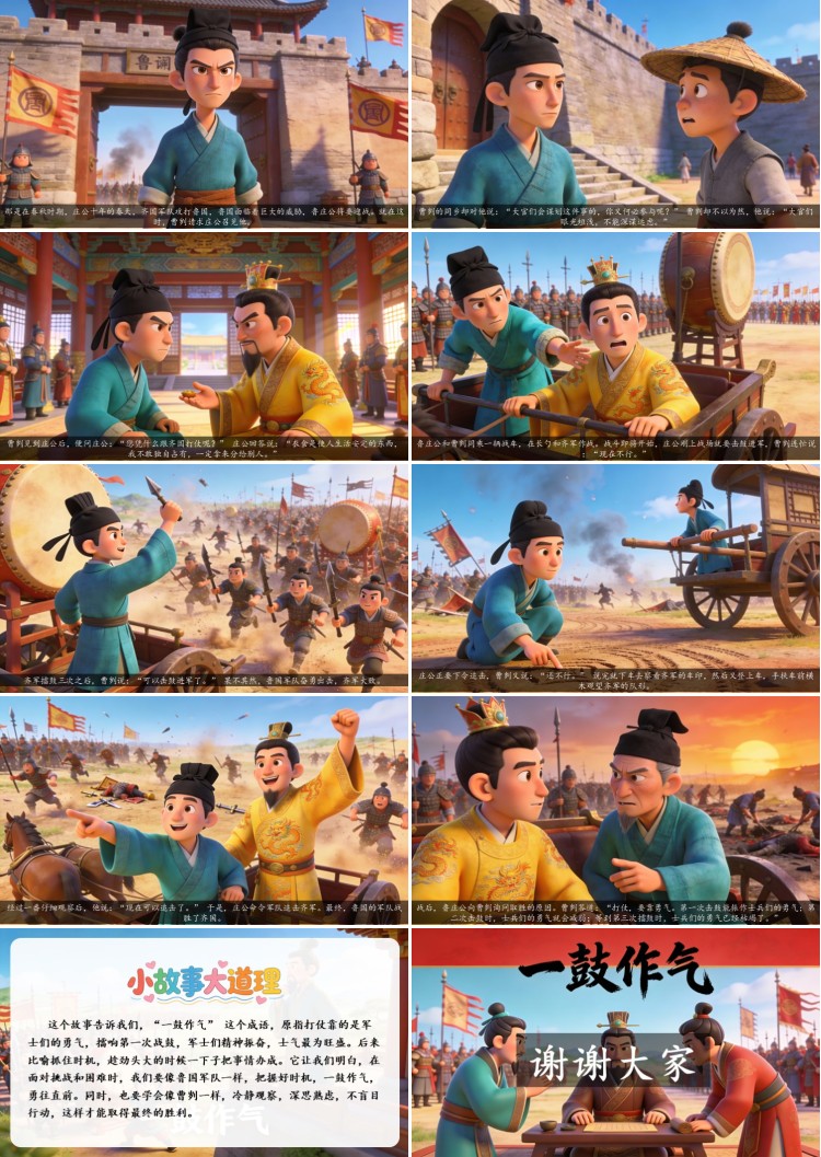 这个故事告诉我们,“一鼓作气” 这个成语,原指打仗靠的是军士们的勇气,擂响第一次战鼓,军士们精神振奋,士气最为旺盛。后来比喻抓住时机,趁劲头大的时候一下子把事情办成。它让我们明白,在面对挑战和困难时,我们要像鲁国军队一样,把握好时机,一鼓作气,勇往直前。同时,也要学会像曹刿一样,冷静观察,深思熟虑,不盲目行动,这样才能取得最终的胜利。