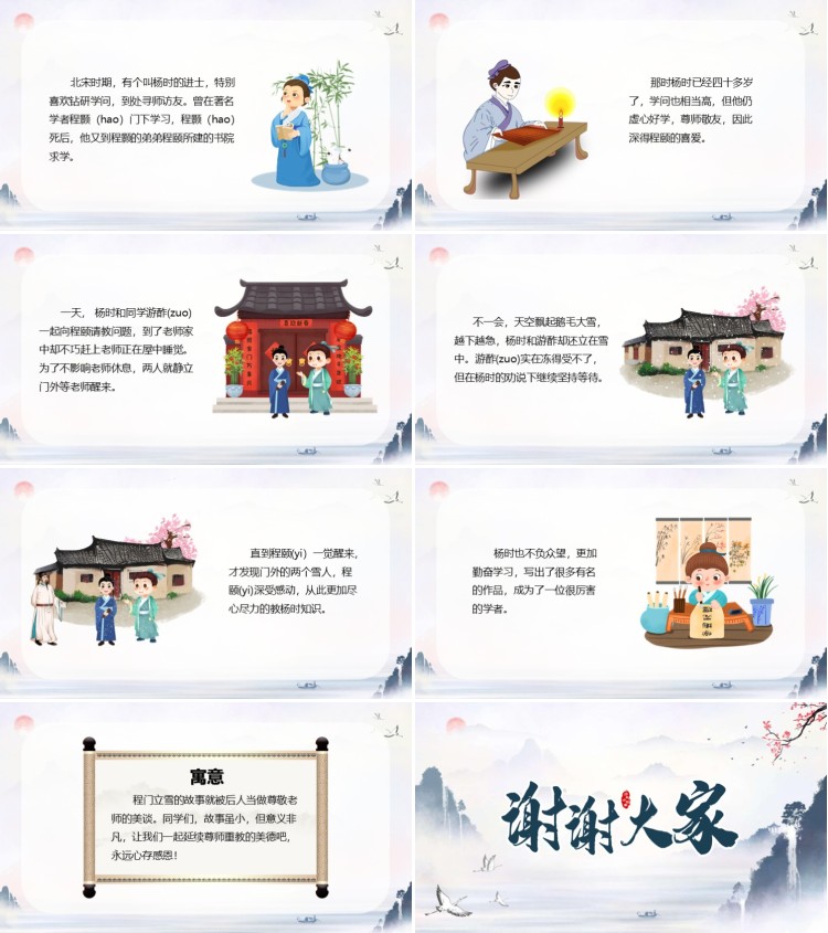 一天, 杨时和同学游酢一起向程颐请教问题,到了老师家中却不巧赶上老师正在屋中睡觉。为了不影响老师休息,两人就静立门外等老师醒来,不一会,天空飘起鹅毛大雪,越下越急,杨时和游酢却还立在雪中。游酢实在冻得受不了,但在杨时的劝说下继续坚持等待。直到程颐(yi)一觉醒来,才发现门外的两个雪人,程颐(yi)深受感动,从此更加尽心尽力的教杨时知识,,杨时也不负众望,更加勤奋学习,写出了很多有名的作品,成为了一位很厉害的学者。后来,程门立雪的故事就被后人当做尊敬老师的美谈。同学们,故事虽小,但意义非凡,让我们一起延续尊师重教的美德吧,永远心存感恩!我的