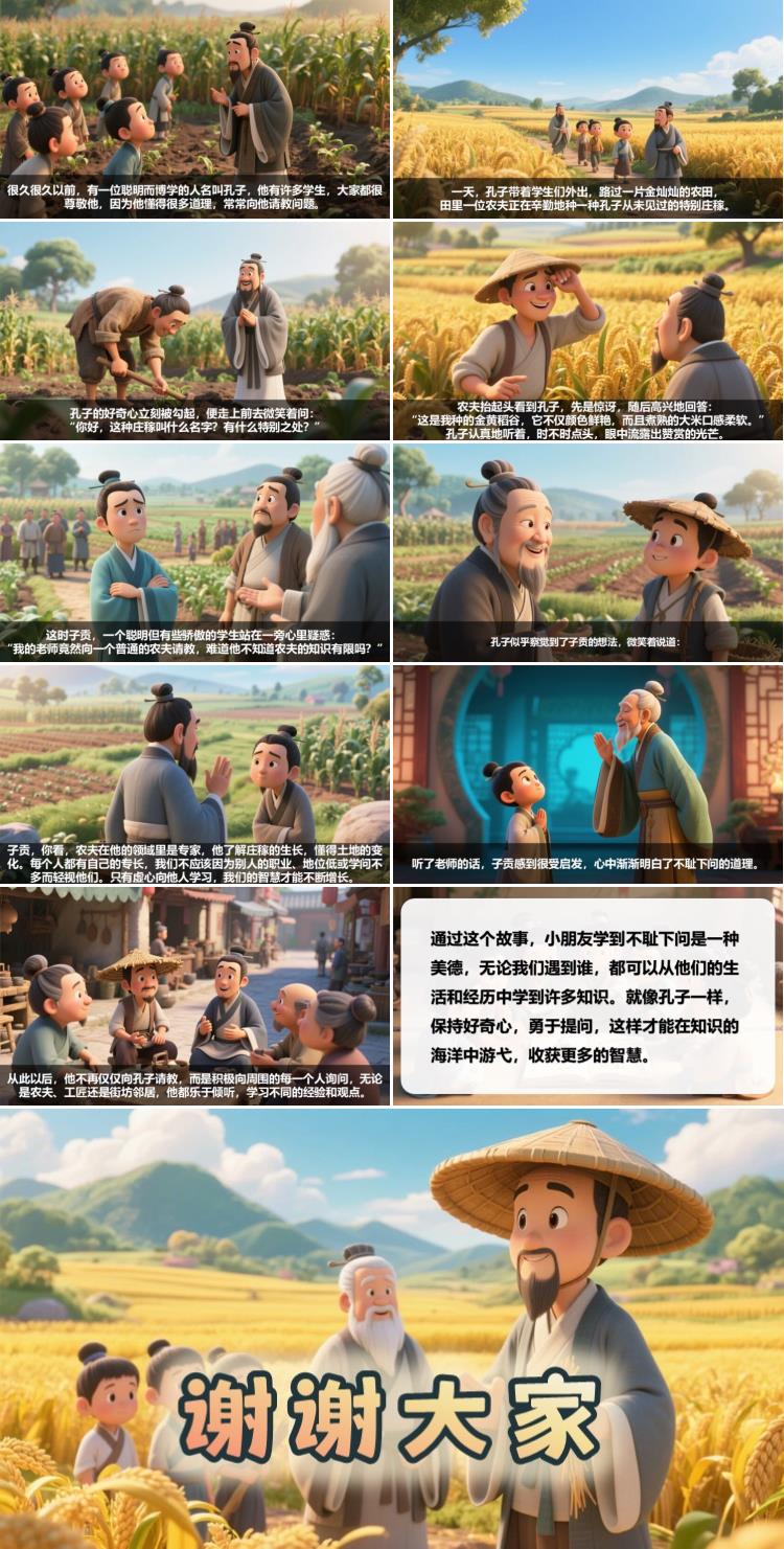 通过这个故事,小朋友学到不耻下问是一种美德,无论我们遇到谁,都可以从他们的生活和经历中学到许多知识。就像孔子一样,保持好奇心,勇于提问,这样才能在知识的海洋中游弋,收获更多的智慧。