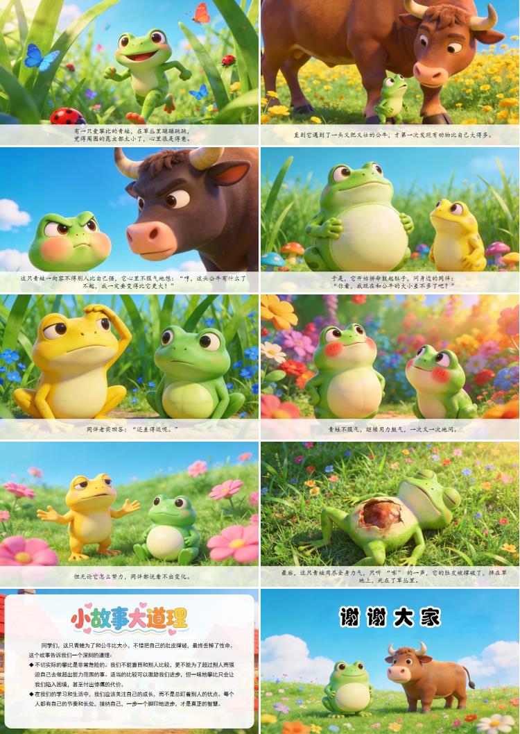同学们,这只青蛙为了和公牛比大小,不惜把自己的肚皮撑破,最终丢掉了性命。这个故事告诉我们一个深刻的道理: