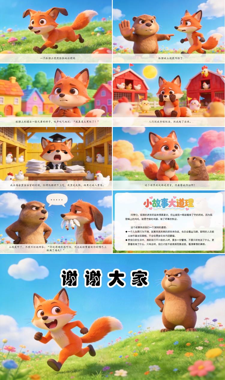 同学们,狐狸的谎言听起来情真意切,但土拨鼠一眼就看穿了它的把戏。因为狐狸嘴上的鸡毛,就是它偷吃鸡蛋、做了坏事的铁证。