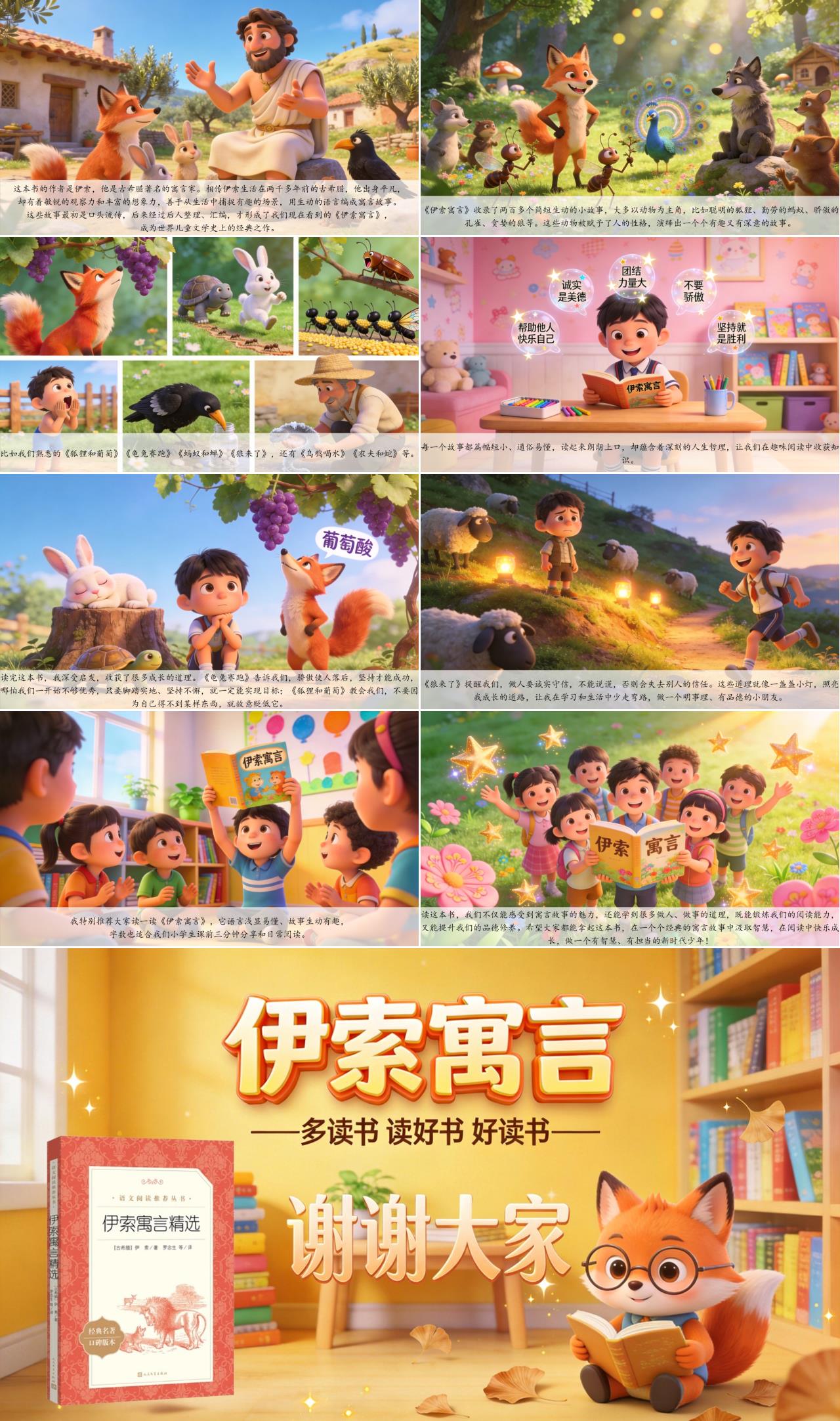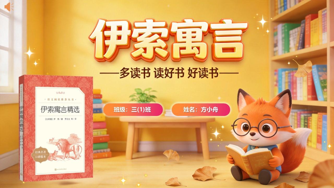 尊敬的老师、亲爱的同学们,大家好!今天,我要给大家分享一本享誉世界的经典好书——《伊索寓言》。它就像一颗充满智慧的明珠,历经千年依然闪耀,每一个短小的故事里都藏着大大的道理,陪伴着一代又一代小朋友成长,特别适合我们小学生阅读。