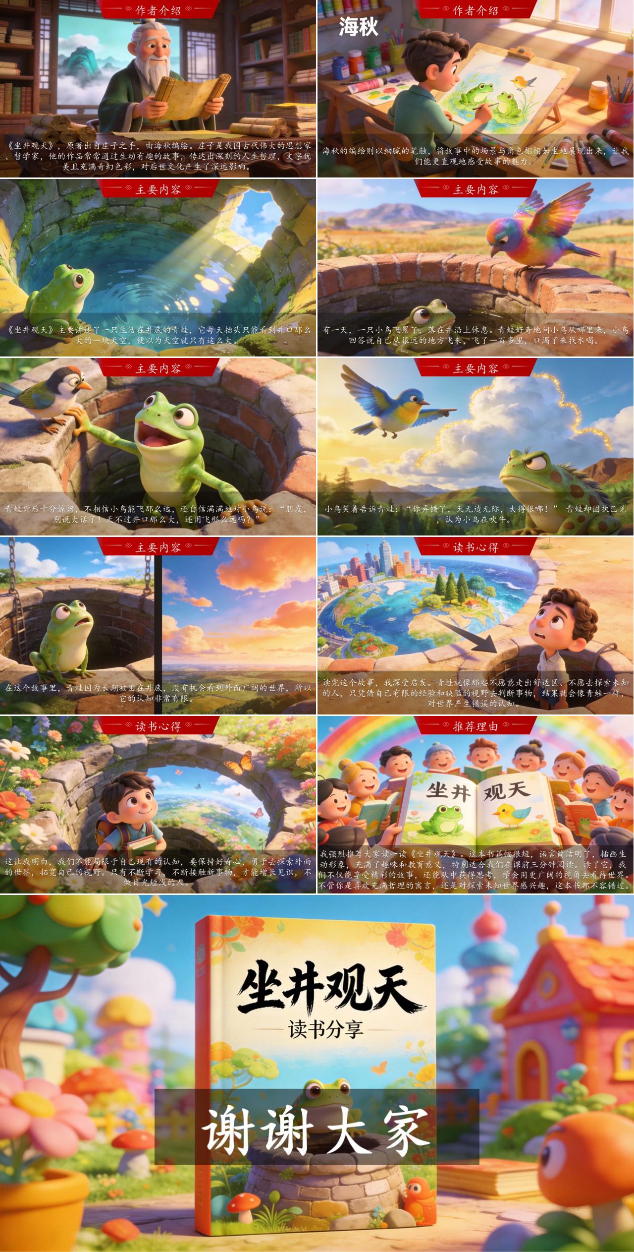 我强烈推荐大家读一读《坐井观天》。这本书篇幅很短,语言简洁明了,插画生动形象,充满了趣味和教育意义,特别适合我们在课前三分钟阅读。读了它,我们不仅能享受精彩的故事,还能从中获得思考,学会用更广阔的视角去看待世界。不管你是喜欢充满哲理的寓言,还是对探索未知世界感兴趣,这本书都不容错过。