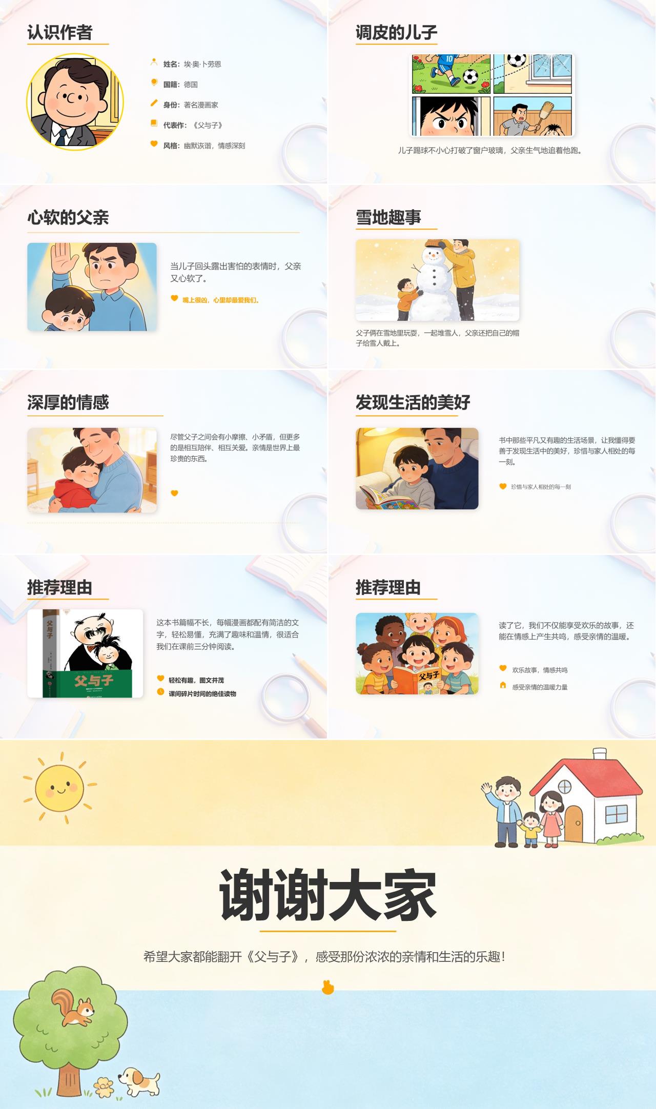 我强烈推荐大家读一读《父与子》。这本书篇幅不长,每幅漫画都配有简洁的文字,轻松易懂,充满了趣味和温情,很适合我们在课前三分钟阅读。读了它,我们不仅能享受欢乐的故事,还能在情感上产生共鸣,感受亲情的温暖。不管你是喜欢幽默的漫画,还是对展现家庭生活的作品感兴趣,这本书都值得一读。