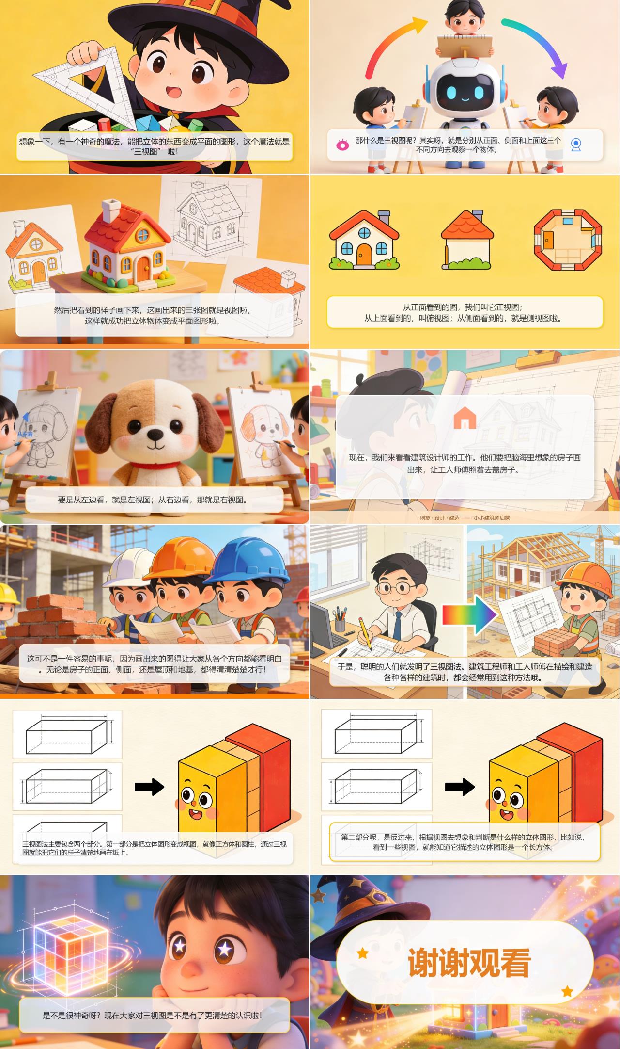 现在,我们来看看建筑设计师的工作。他们要把脑海里想象的房子画出来,让工人师傅照着去盖房子。这可不是一件容易的事呢,因为画出来的图得让大家从各个方向都能看明白。于是,聪明的人们就发明了三视图法。建筑工程师和工人师傅在描绘和建造各种各样的建筑时,都会经常用到这种方法哦。