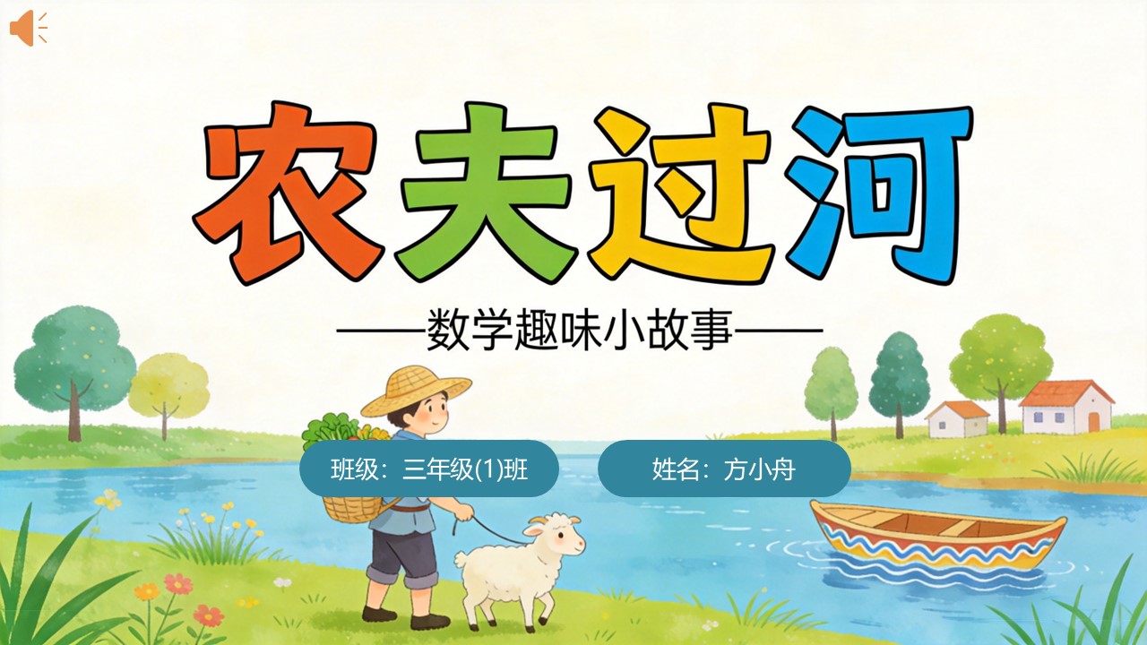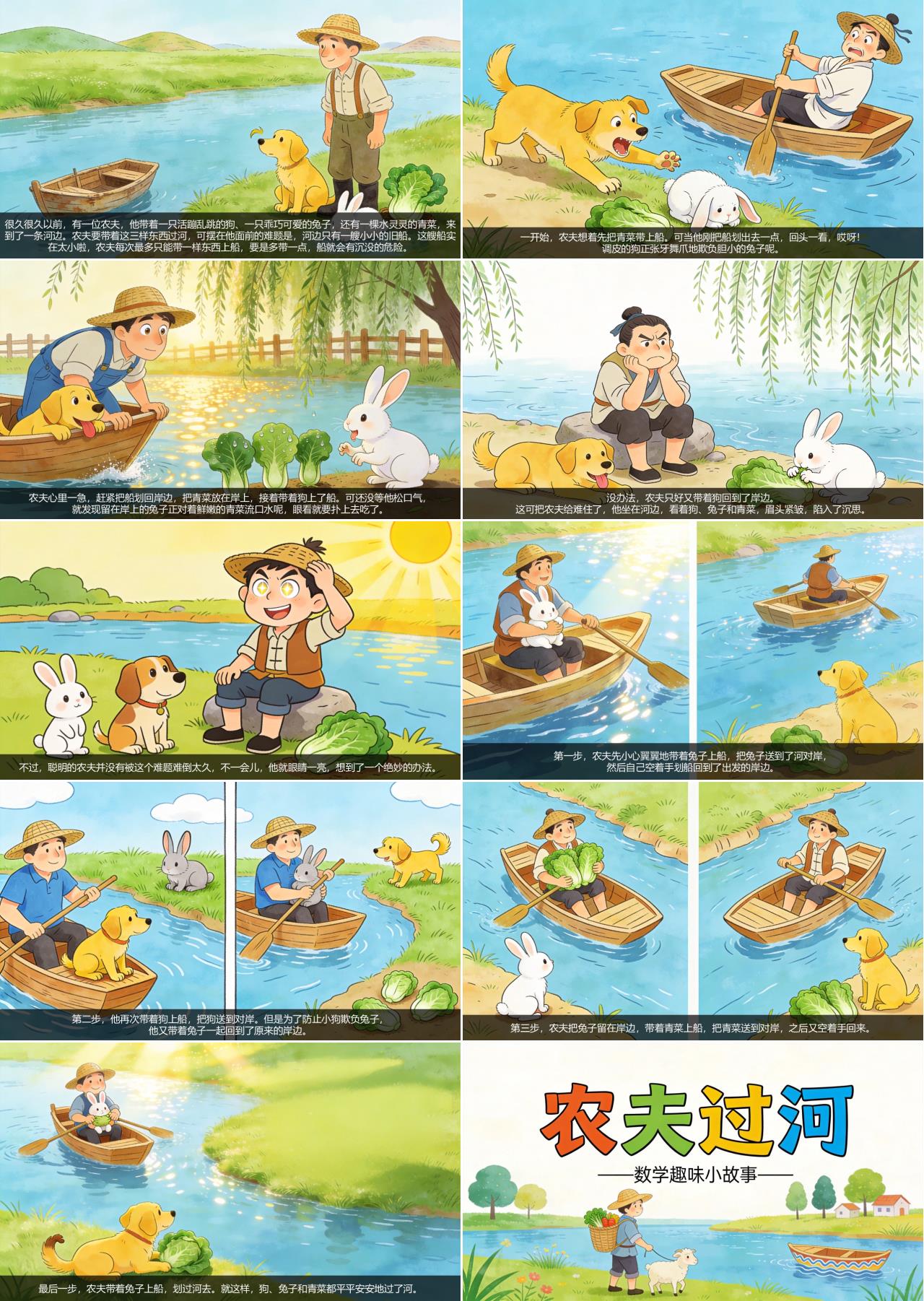 很久很久以前,有一位农夫,他带着一只活蹦乱跳的狗、一只乖巧可爱的兔子,还有一棵水灵灵的青菜,来到了一条河边。农夫要带着这三样东西过河,可摆在他面前的难题是,河边只有一艘小小的旧船。这艘船实在太小啦,农夫每次最多只能带一样东西上船,要是多带一点,船就会有沉没的危险。