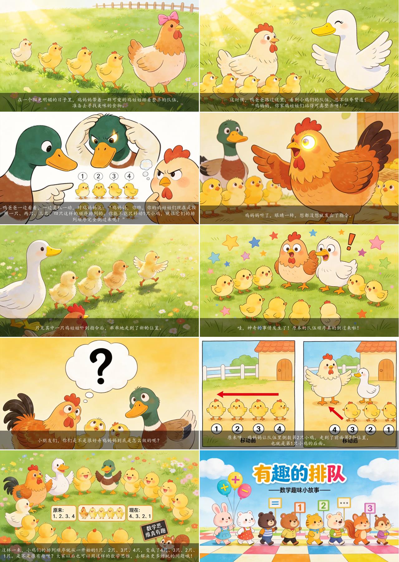 鸡妈妈听了,眼睛一转,想都没想就发出了指令。只见其中一只鸡娃娃听到指令后,乖乖地走到了新的位置。哇,神奇的事情发生了!原本的队伍顺序真的倒过来啦!