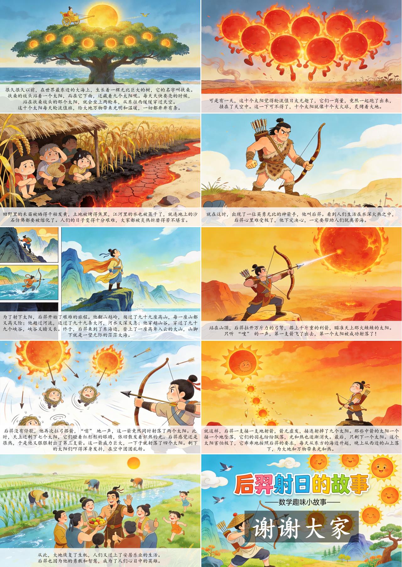 可是有一天,这十个太阳觉得轮流值日太无趣了,它们一商量,竟然一起跑了出来,挂在了天空中。这一下可不得了,十个太阳就像十个大火球,炙烤着大地。田野里的禾苗被晒得干枯发黄,土地被烤得焦黑,江河里的水也被蒸干了,就连地上的沙石仿佛都要被熔化了。人们的日子变得十分艰难,大家都被炎热折磨得苦不堪言。