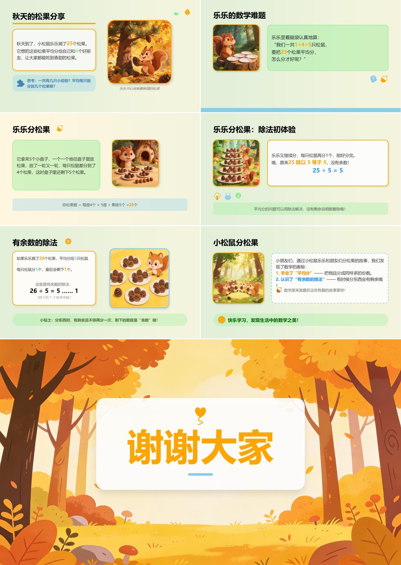 秋天到了,小松鼠乐乐摘了25个松果,它想把这些松果平均分给自己和4个好朋友,让大家都能吃到香甜的松果。乐乐歪着脑袋算:“我们一共1+4=5只松鼠,要把25个松果平均分,怎么分才好呢?”