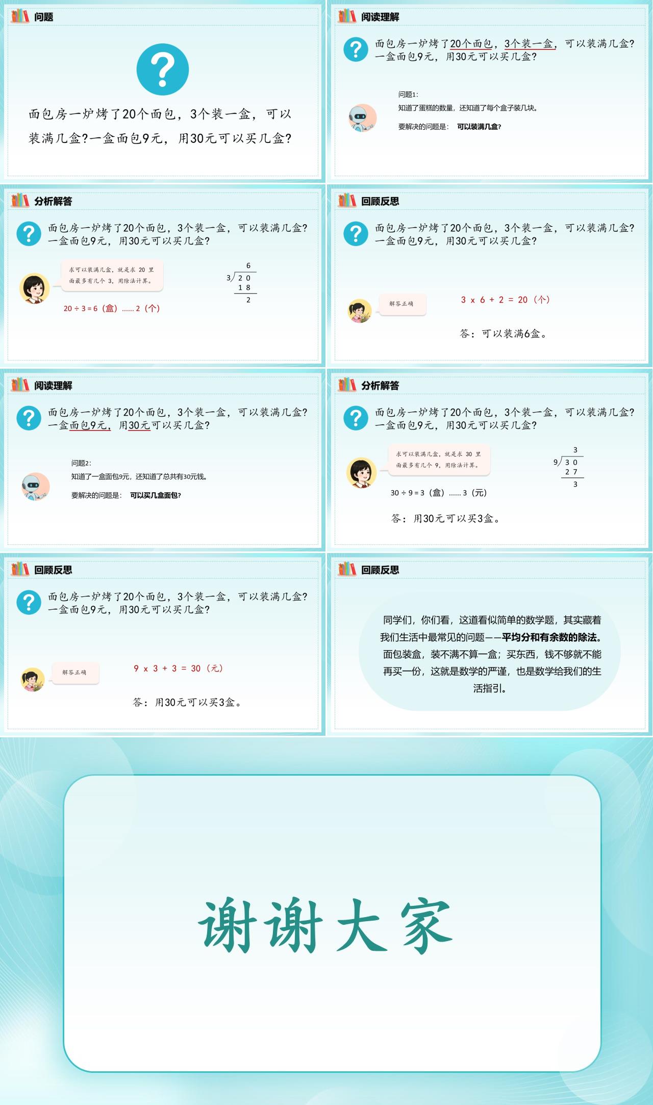 同学们,你们看,这道看似简单的数学题,其实藏着我们生活中最常见的问题——平均分和有余数的除法。面包装盒,装不满就不算一盒;买东西,钱不够就不能再买一份,这就是数学的严谨,也是数学给我们的生活指引。