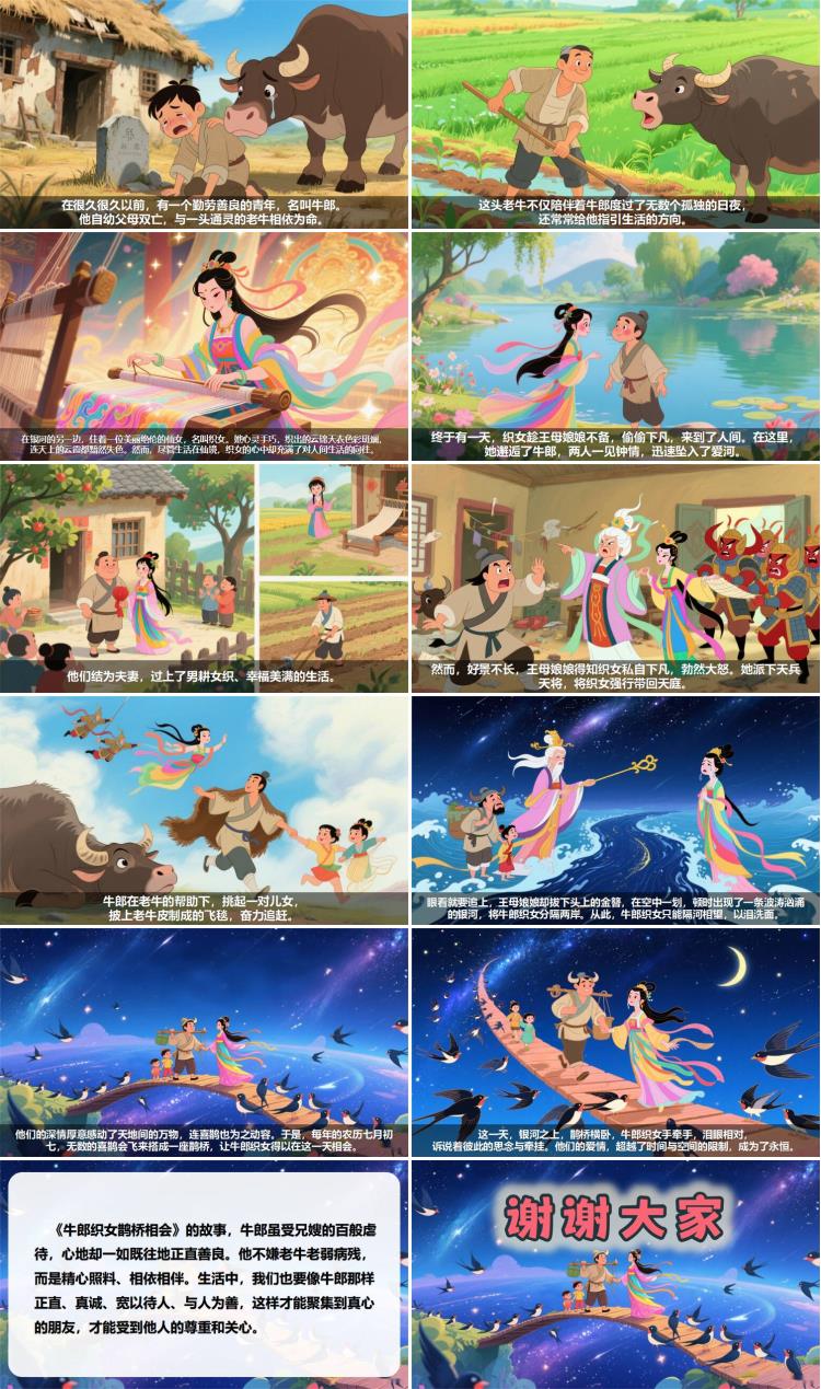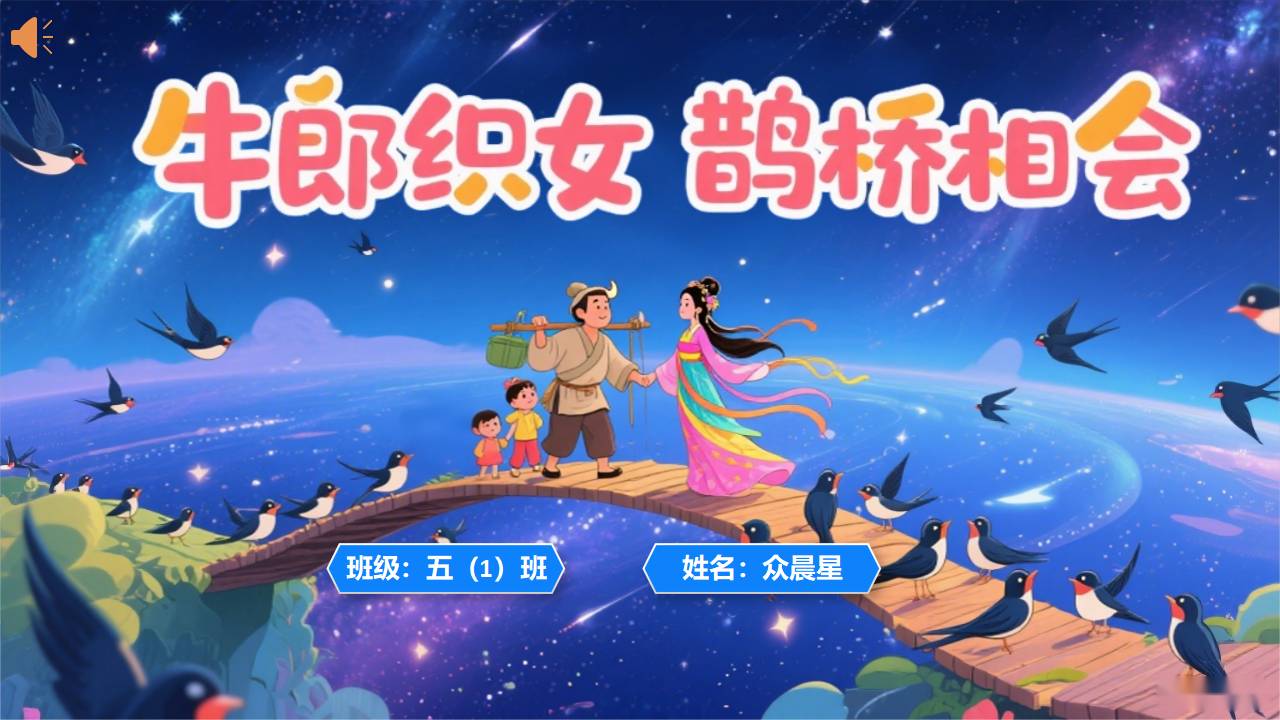 我是五年级一班的众晨星,非常荣幸能在这里与大家分享一个流传千古、感人至深的民间故事——《牛郎织女鹊桥相会》。