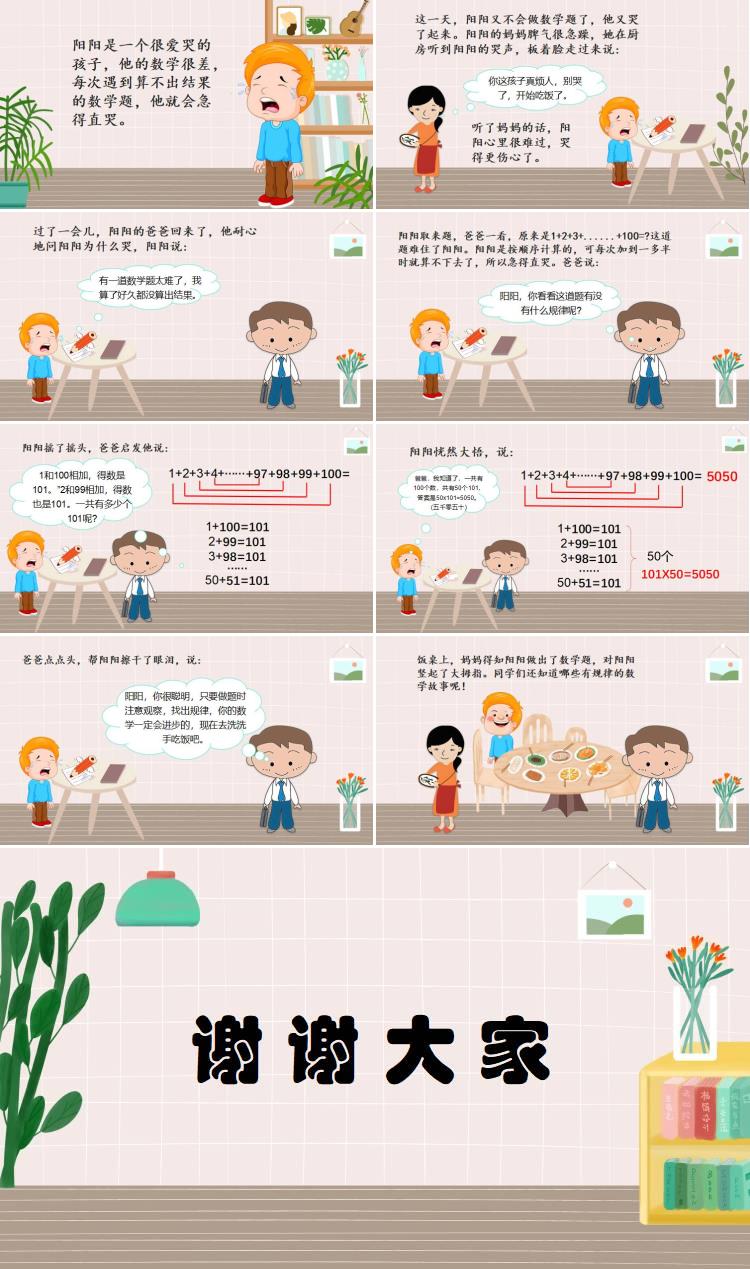 过了一会儿,阳阳的爸爸回来了,他耐心地问阳阳为什么哭,阳阳说:“有一道数学题太难了,我算了好久都没算出结果。’阳阳取来题,爸爸一看,原来是1+2+3+......+100=?这道题难住了阳阳。阳阳是按顺序计算的,可每次加到一多半时就算不下去了,所以急得直哭。爸爸说:“阳阳,你看看这道题有没有什么规律呢?”阳阳摇了摇头,爸爸启发他说:“1和100相加,得数是101。”2和99相加,得数也是101。一共有多少个101呢?阳阳恍然大悟,说:“爸爸,我知道了,一共有100个数,共有50个101,答案是50x101=5050。(五千零五十)”爸爸点点头,帮阳阳擦干了眼泪,说:“阳阳,你很聪明,只要做题时注意观察,找出规律,你的数学一定会进步的,现在去洗洗手吃饭吧。”
