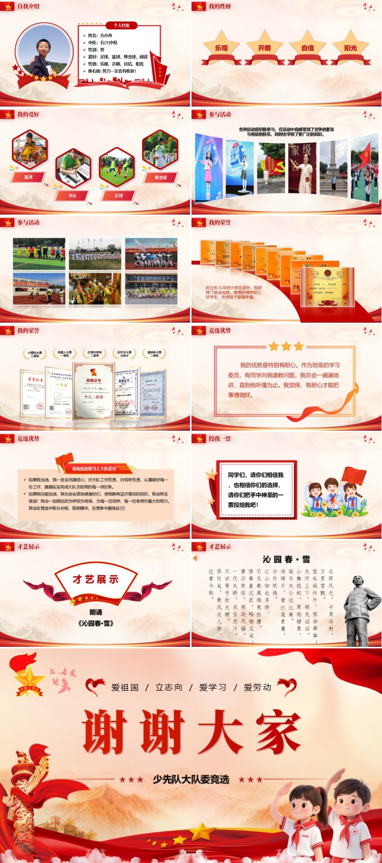 很荣幸参加此次竞选,我是来自五(1)中队的方小舟。是一个活泼、善良、好动、乐于助人的男孩。我兴趣广泛,喜欢足球、篮球、棒垒球、羽毛球等。我学习刻苦、做事认真、团结同学,热爱集体。