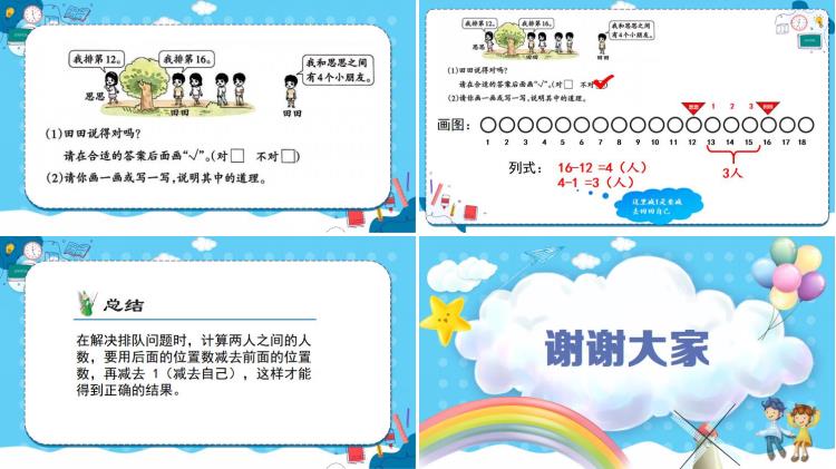 接下来算一算他们之间有几个小朋友。用田田的位置数减去思思的位置数,列式是 16-12=4,但这里要注意,这个结果里包含了田田自己的位置,所以需要减去田田自己,也就是 4-1=3。这说明思思和田田之间其实有 3 个小朋友。
