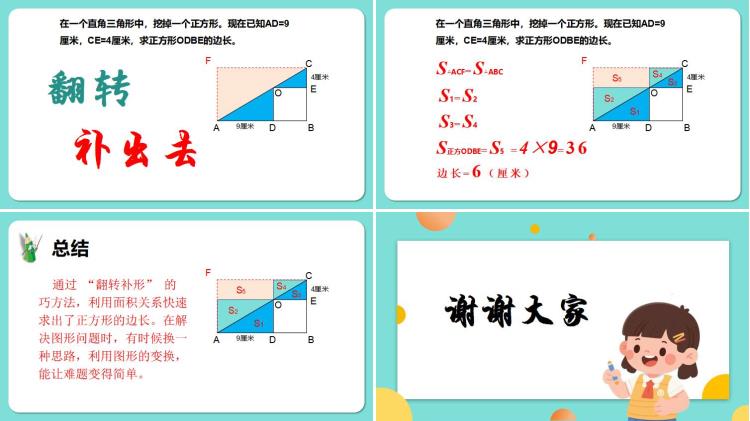 总结一下,这道题没有用复杂的计算,而是通过 “翻转补形” 的巧方法,利用面积关系快速求出了正方形的边长。在解决图形问题时,有时候换一种思路,利用图形的变换,能让难题变得简单。