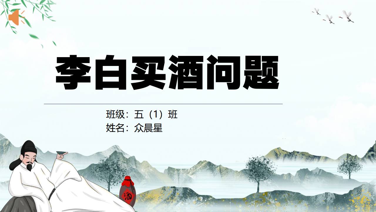 大家好!我是五(1)班的众晨星。今天,我要给大家讲解一道充满诗意的数学题 ——“李白买酒问题”。这道题可是结合了古诗和数学智慧哦,让我们一起来探索吧!