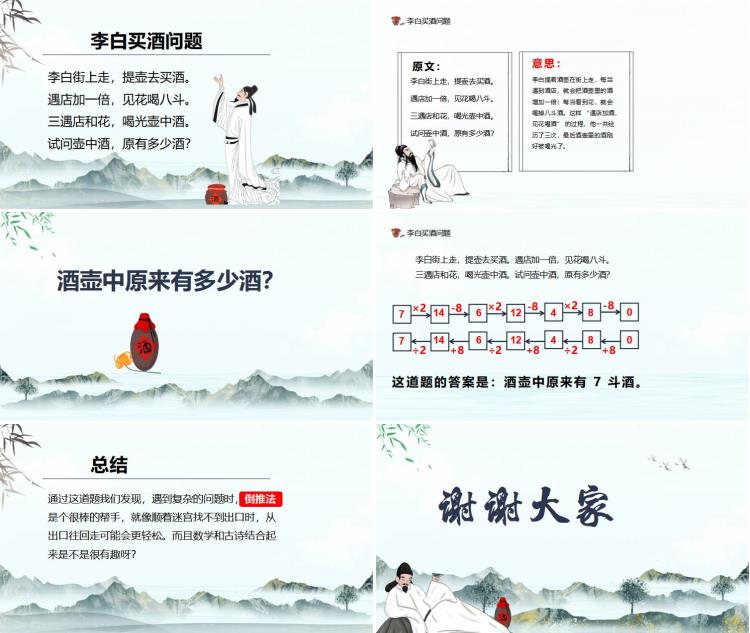 通过这道题我们发现,遇到复杂的问题时,倒推法是个很棒的帮手,就像顺着迷宫找不到出口时,从出口往回走可能会更轻松。而且数学和古诗结合起来是不是很有趣呀?